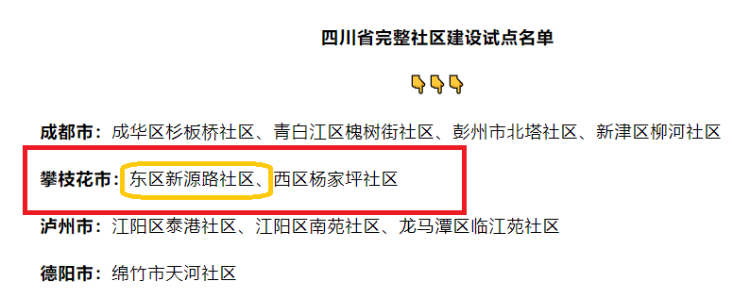 近日,四川省住房和城乡建设厅、四川省民政厅联合发布了《关于印发四川省完整社区建设试点名单的通知》决定在全省13个市州25个社区开展为期2年的省级完整社区建设试点工作,东区新源路社区入选。