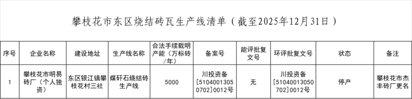 根据《攀枝花市经济和信息化局关于报送水泥砖瓦行业生产线清单的通知》的文件要求,现就东区烧结砖瓦行业产能进行公示,具体情况如下表: