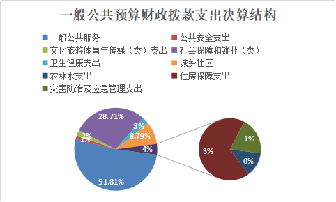 2020年一般公共预算财政拨款支出1505.89万元,主要用于以下方面:一般公共服务(类)支出780.2万元,占51.81%;文化旅游体育与传媒(类)支出32.99万元,占2.19%;社会保障和就业(类)支出432.25万元,占28.71%;卫生健康支出42.32万元,占2.81%;住房保障支出42.63万元,占2.83%;城乡社区132.44万元,占8.79%;公共安全支出23.07万元,占1.53%;农林水支出8万元,占0.53%;灾害防治及应急管理支出12.1万元,占0.80%。