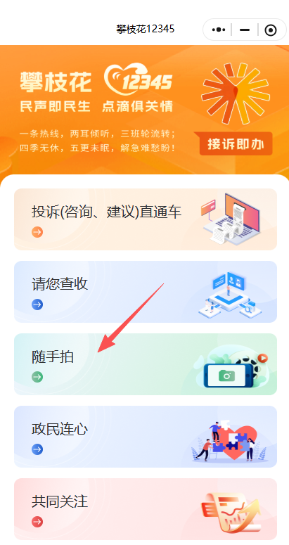 2.进入“攀枝花市12345”小程序,点击“投诉(咨询、建议)直通车或者“随手拍”;