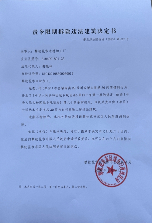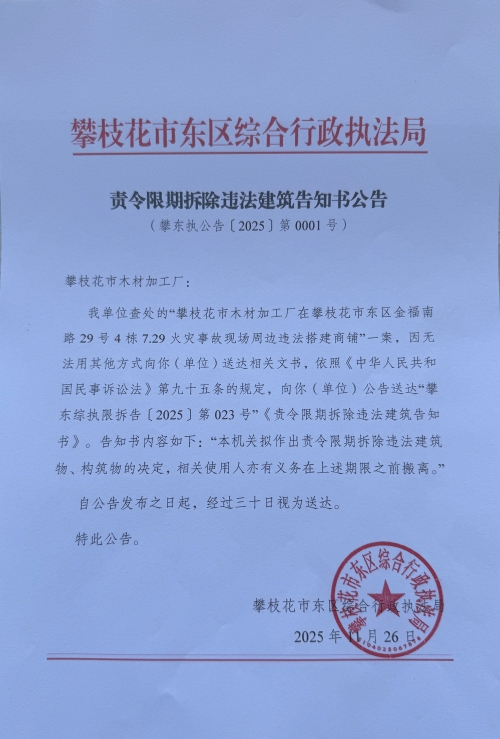 我单位查处的“攀枝花市木材加工厂在攀枝花市东区金福南路29号4栋7.29火灾事故现场周边违法搭建商铺”一案,因无法用其他方式向你(单位)送达相关文书,依照《中华人民共和国民事诉讼法》第九十五条的规定,向你(单位)公告送达“攀东综执限拆告〔2025〕第023号”《责令限期拆除违法建筑告知书》。决定书内容如下:“本机关责令你(单位)于送达本决定书30日内自行拆除上述违法建筑物、构筑物,相关使用人亦有义务在上述期限之前搬离。”