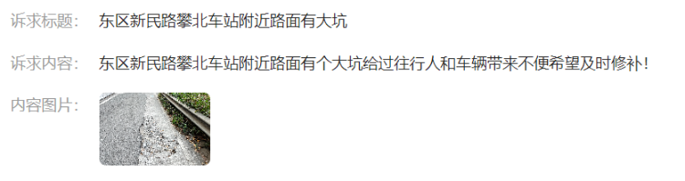 近日,一市民通过“幸福东区”APP问政栏目反映,“新民路攀北车站附近路面有个大坑,给过往行人和车辆带来不便,希望相关部门能及时修补。”