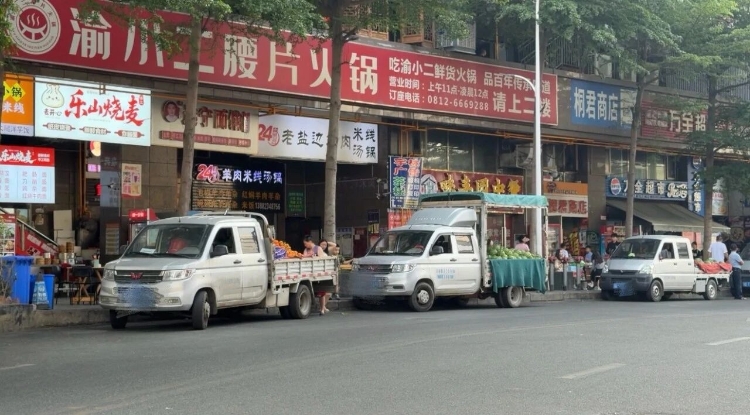 记者注意到,距离该路段中间位置便设有一处农贸市场,但不少商贩仍选择在路边摆摊。“在外面摆摊更容易招揽客人,生意好些。”一位商贩坦言。当记者问及占道经营带来的交通安全和环境卫生问题时,该商贩却未正面回答。