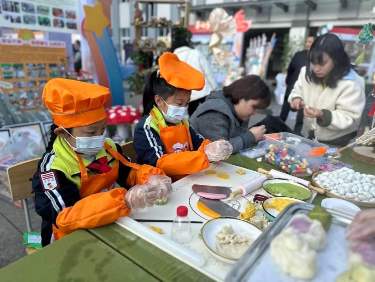 非遗手作、美食制作、机器人互动……在场外展区,九大学区各自亮出“绝活”,精彩纷呈。各学区通过图文展板、实物陈列、现场体验等形式,直观呈现研学课程的特色与成效;互动体验区更是人气爆棚,“攀果种植小实验”“模型拼装”“手工技艺”等趣味活动让观众纷纷动手尝试,学生志愿者们耐心引导,现场欢声笑语不断。