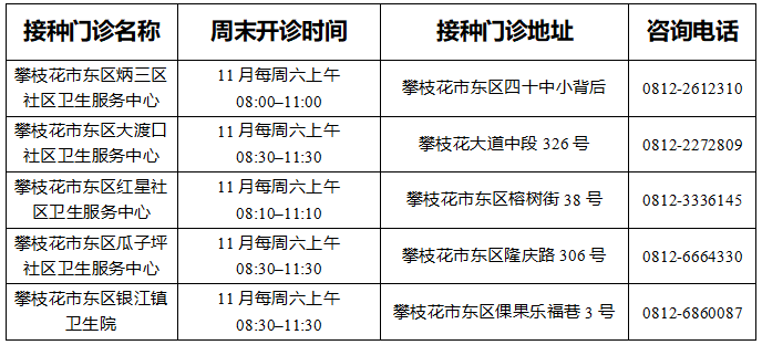 您好!根据东区接种需求,现对辖区内疫苗接种点开诊时间进行动态调整,工作日接种时间不变,增设周末接种点(11月1日、11月8日、11月15日、11月22日、11月29日),相关安排公布如下,请您仔细阅读并悉知!
