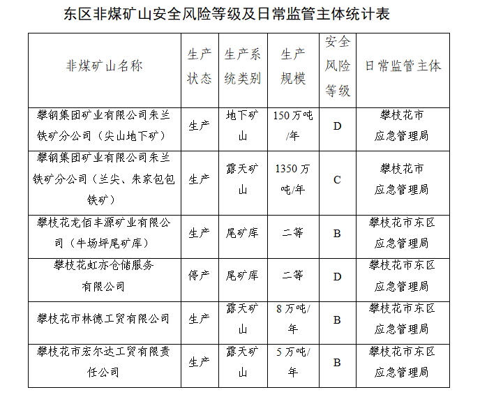 为贯彻落实《国家矿山安全监察局关于印发<非煤矿山安全风险分级监管办法>的通知》(矿安〔2023〕1号)和《四川省应急管理厅关于贯彻落实<非煤矿山安全生产风险分级监管办法>的通知》文件精神,按照《攀枝花市应急管理局关于印发<攀枝花市非煤矿山“红黄蓝绿”牌分级分类监管实施细则(试行)》的通知>(攀应急〔2025〕9号)工作要求,攀枝花市东区应急管理局组织辖区非煤矿山企业严格按照评分要求,对标对表开展分级自评工作,并对照评分标准逐项核实非煤矿山企业自评情况,完成审核确认工作。现将东区非煤矿山安全风险等级结果和日常监管主体情况公示如下。