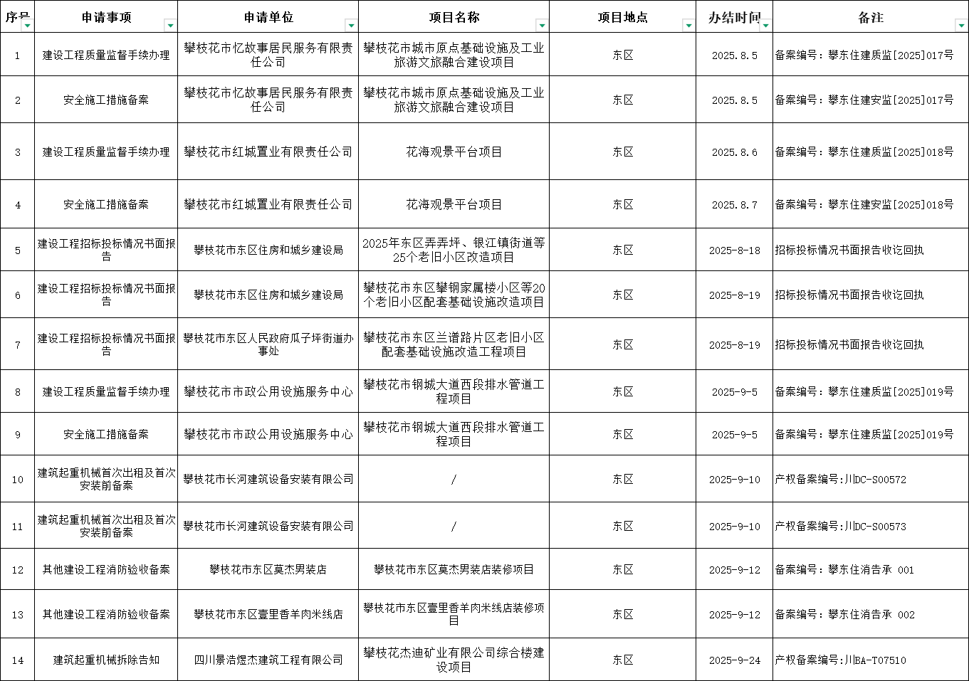攀枝花市东区住房和城乡建设局《行政审批服务事项信息公示》2025年9月