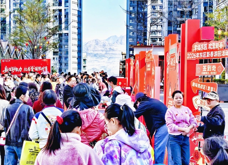 2月4日上午,攀枝花市东区太谷广场人潮涌动、喜气洋溢,一场以“幸福东区,欢聚新春”为主题的2026年新春游园会在这里欢乐举行。丰富多彩的非遗体验、趣味互动与音乐演出,吸引了众多市民和游客前来参与,共同沉浸于浓郁的年味与团聚氛围之中。