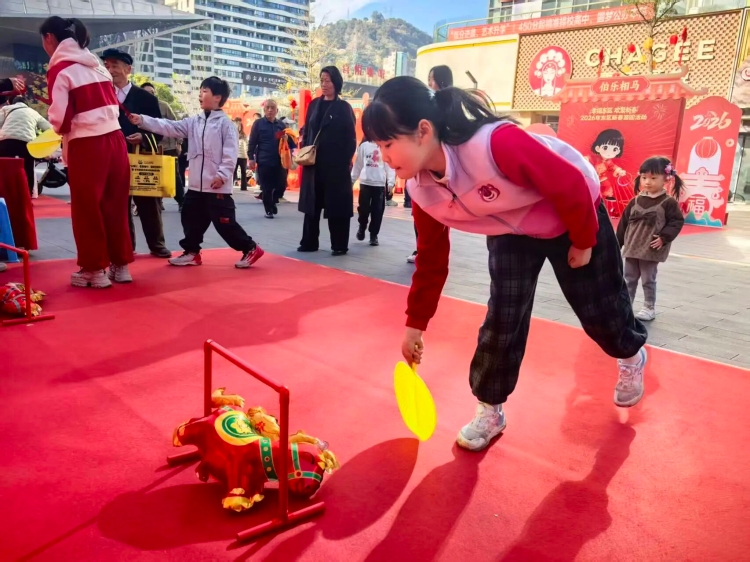 旁边的“四平八稳”游戏前,小朋友们屏息瞄准,小球滚入得分区时,周围响起一片喝彩声。现场还有“马球得分赛”“跃马争春”“马踏飞燕”等闯关小游戏,每个摊位前都排满了人。 与之呼应的是舞台区流淌的旋律。民谣乐队弹唱着悠扬的老歌,偶尔穿插新春喜庆的曲调。在“歌曲接龙”环节,市民们踊跃参与,答对后四周便传来阵阵掌声。