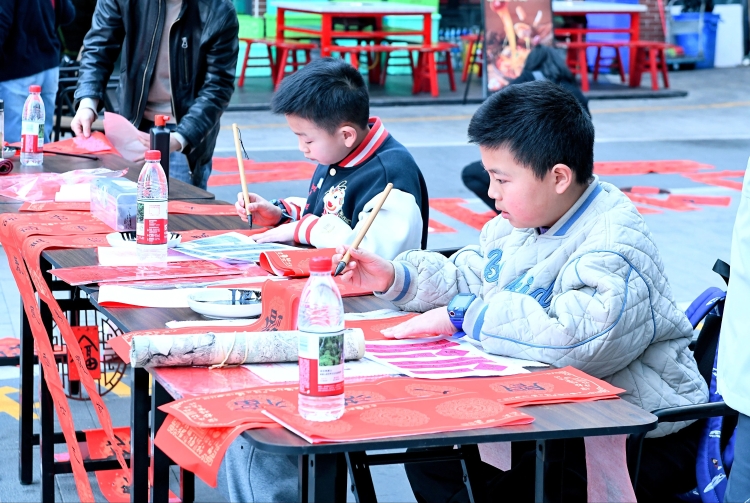 整个游园会笼罩在温暖的色调中。红纸在剪刀下变成形态各异的窗花,墨汁在宣纸上晕染出饱满的“福”字,琥珀色的糖浆凝成晶莹的小马……