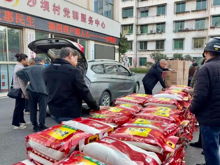 2月11日一早,东区银江镇沙坝村村委会外小广场热闹非凡,一袋袋大米、一桶桶食用油整齐堆放,这是沙坝村年底的“福利”发放现场,1346名村民人人有份。