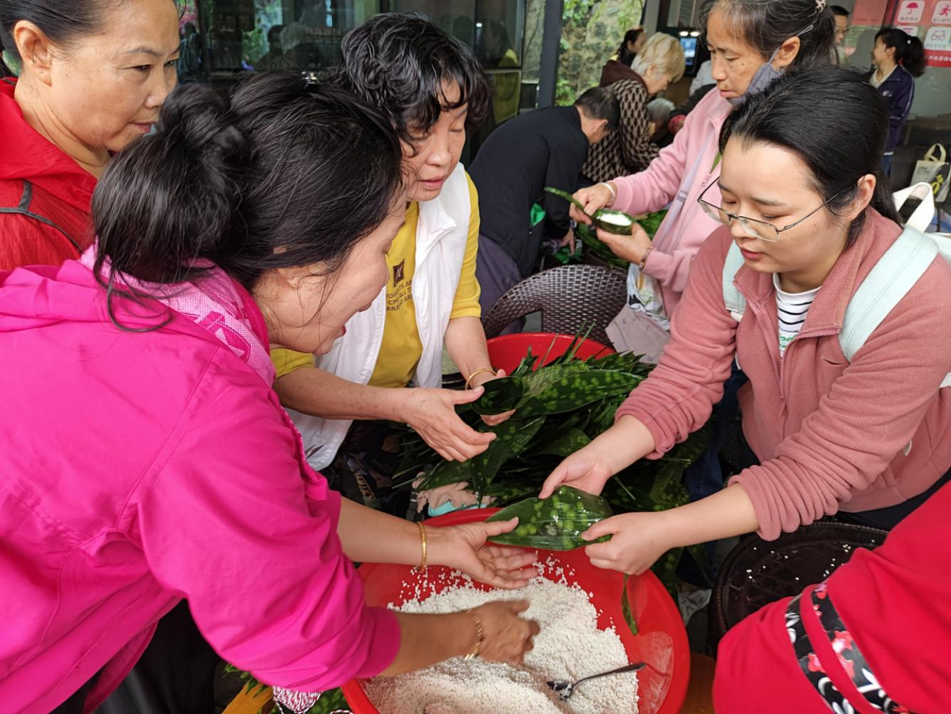 “以前看着觉得很简单,第一次上手包,这米总是漏出来呀!”在李阿姨的手把手教学下,青年志愿者黄倚微在现场学会了三角粽和四角粽的包法,也逐渐熟练起来。。现场欢声笑语不断,居民们脸上洋溢着幸福的笑容,有人将自己包的粽子小心翼翼地打包带回家,准备与家人分享这份节日喜悦;包得快的 “老手” 则热情地将多包出来的粽子送给周围围观的居民,一颗颗粽子传递的不仅是美味,更是邻里间浓浓的情谊,现场热闹非凡。
