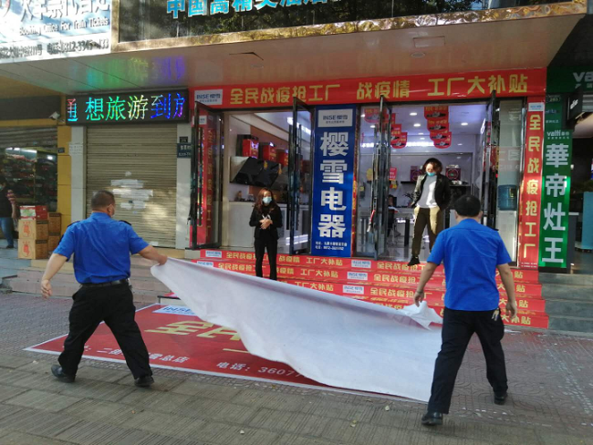 强力治理弹奏管控曲,减少人员聚集带来的疫情传播隐患,营造整洁有序市容环境。3月10日以来,共出动380余人(次)、车辆48台(次),重点对炳草岗片区主干道沿线乱摆摊点、坐商不归店等市容乱象进行治理,劝离未戴口罩进入便民市场人员200余人(次),取缔流动摊点260余个(次),劝导占道经营车辆140余台(次),规范占道经营商家160余家(次),拆除违规、破损广告(横幅)60余处,最大限度降低辖区内人员聚集行为产生,有效降低公共场所疫情传播机率,为各行各业复工复产营造了良好的外部市容环境。