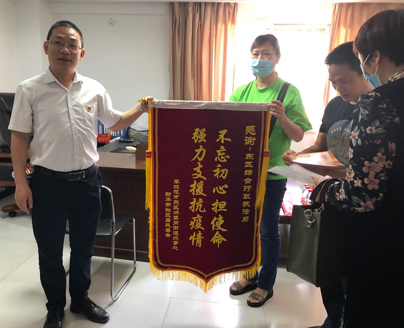 “感谢您们!真的太感谢区综合执法局了!在我们最困难的时候,帮我们解决了卡点值班问题!”炳草岗街道新华社区党委书记黄福英带着一面锦旗和26封感谢信专程来到区综合行政执法局对我局支持该社区银河A座卡点值守表示感谢。