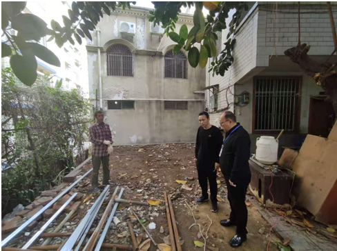 11月10日,区综合执法局执法人员查勘老友茶楼旁搭建构筑物情况。