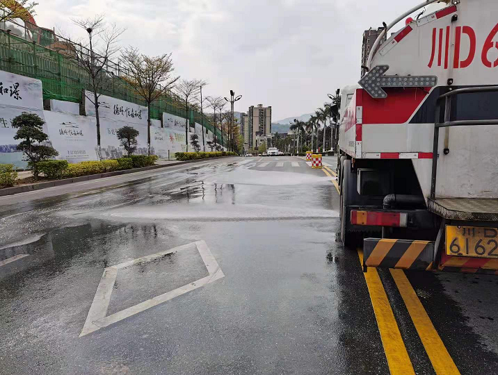 通过水车1.5小时高压循环冲洗,耗水16吨,道路恢复整洁,有效保障了市民出行环境卫生。