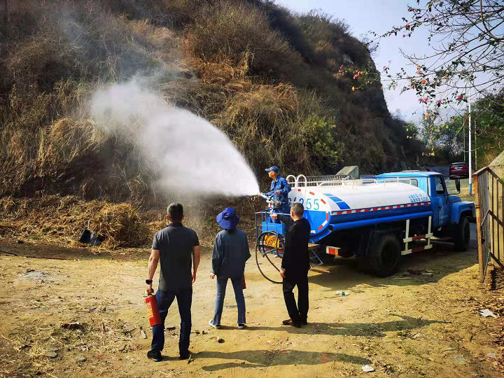 演练现场灭火队员们使用干粉灭火器、水车等消防器材对模拟着火点进行扑灭,积极阻断火势发展,逐步将火势控制,大火最终被扑灭。