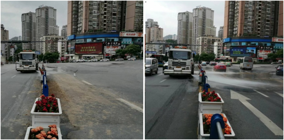 为尽快消除安全隐患,区综合执法局相关部门清理完事故现场杂物后,立即调派1台水车,用水8吨,对污染路面进行往返应急冲洗处置。通过快速有效的冲洗道路,确保了道路畅通,减少了道路交通安全隐患,有效抑制了扬尘污染。