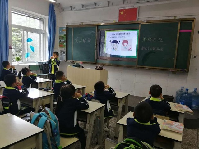 首先,学校德育处利用晨会以主题讲话的形式向全校学生发起爱眼护眼倡议,接着1-6年级开展了“爱护眼睛,预防近视”主题班会。班会上,老师向学生介绍了近视的成因,让学生了解基本的眼部结构以及近视预防知识。不仅如此,学校还组织4-6年级学生制作了预防近视知识小卡并在全校进行了一次眼操突击检查评比活动。