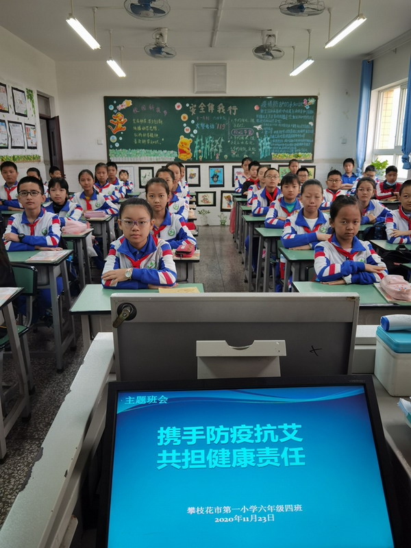 我校利用主题班会,详细讲解了艾滋病的基本知识、流行现状、预防方法,以及对人体健康危害的严重性。学校还利用电子屏幕、宣传栏、升旗仪式广泛宣传艾滋病相关知识,并要求全校师生熟悉并掌握艾滋病防控知识,学会保护自己、自尊自爱。
