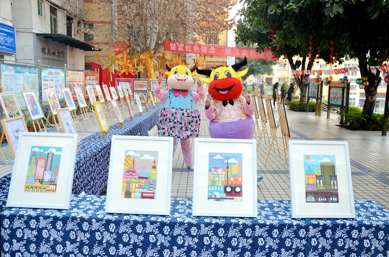 教学楼前,首先印入眼帘的是一排摆放整齐的书画展板,连成一线,蔚为壮观。形式多样的作品,引来前来学校参观的家长们的驻足观看。同学们热情徜徉于书画作品间,赏析其中的红橙黄绿青蓝紫,品评着一笔一画的轻重缓急……尽情享受书画意境之美,内心收获一份安宁与陶染。 展出的作品种类丰富,儿童画、木刻版画,剪纸拼贴等题材多样、形式丰富。一幅幅题材新颖、风格鲜明的书画作品,展示了孩子们的艺术才华,也诠释了师生们对学校学习生活的热爱和对未来的美好憧憬。
