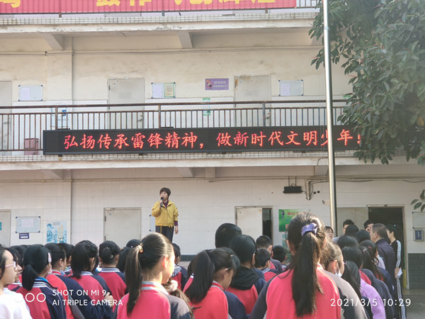 通过旗下讲话的方式,学生会向全校同学发出号召,学习雷锋事迹,传递弘扬雷锋精神。然后由德育处刘主任发出号召,学雷锋,做新时代文明少年,在校园中要团结同学,互帮互助;爱护公务物,维持公共卫生……