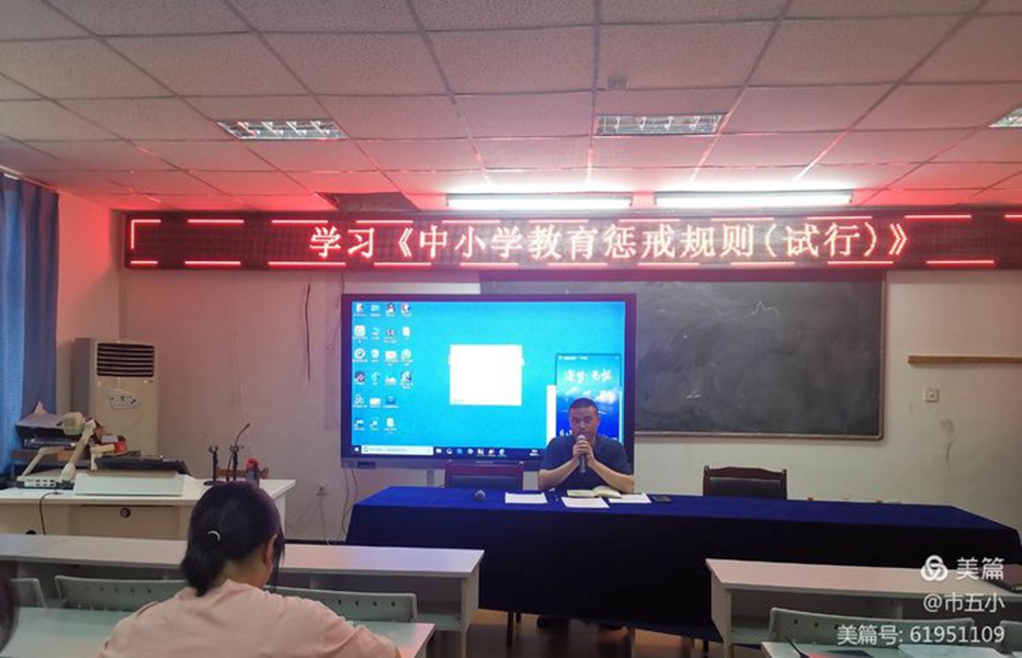 为更好推动学校全面贯彻落实党的教育方针和立德树人根本任务,把教育惩戒纳入法治轨道,将教育部制定颁布的《中小学教育惩戒规则(试行)》(以下简称《规则》)全面落地、顺利实施,5月24日,市五小全体教师齐聚会议室,集中学习《规则》,知晓《规则》内容,领会《规则》精神。