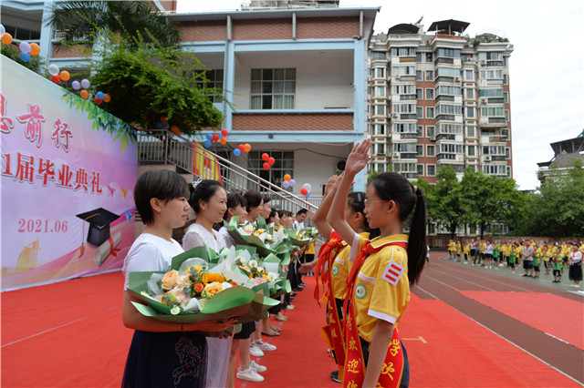 我们的成长离不开老师的教导,更离不开家长的陪伴。感谢父母六年来对学校工作的支持,感恩父母在童年时代的细心照顾。请让我们亲手为您戴上大红花吧,你们就是凤凰校园最美的风景。