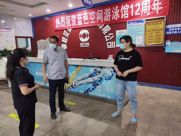东区教体和体育局体卫艺股检查人员对游泳场馆是否严格落实从业人员健康管理制度、测温验码制度、通风消毒制度、预约、错峰制度、应急处置准备等进行检查,同时对健身场馆的消防通道、应急急救设施设备、灭火器等进行安全检查,对存在的隐患问题提出整改意见。