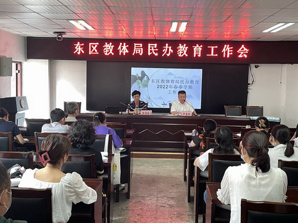 2022年5月13日,攀枝花市东区教育和体育局在局三会议室召开召开民办教育工作会,区属民办幼儿园、民办培训学校、攀钢幼教中心的主要负责人参加会议,区委教育工委委员、副局长尹孟彬同志到会讲话。