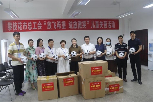 5月31日上午九点,攀枝花市总工会党组成员、机关党总支书记付鸥、女职工部部长孙丽丽一行代表市总工会向我校学生赠送足球、篮球、羽毛球拍、跳绳等体育用品,开展交流座谈活动。东区总工会常务副主席邓高、东区教育局副局长尹孟彬、区教育工会孙雄出席座谈活动。