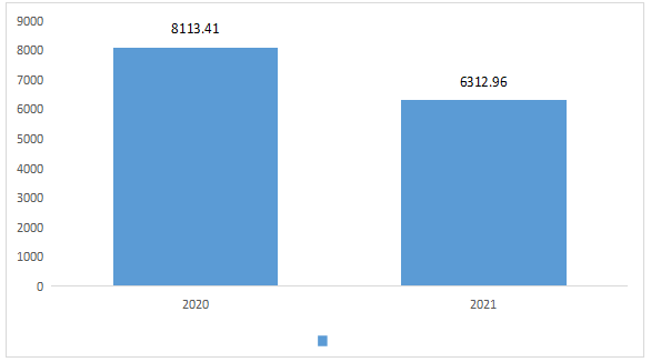 2021年度收、支总计6312.96万元,比2020年收支预算总数减少1800.45万元,减少22.19%,主要变动原因是节约支出。(图4:财政拨款收、支决算总计变动情况)(柱状图)