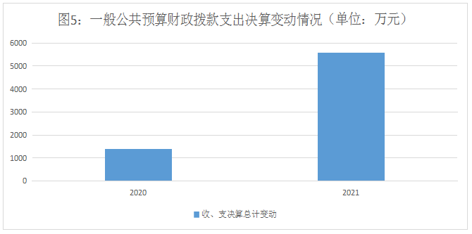 2021年一般公共预算财政拨款支出5567.65万元,占本年支出合计的98.29%。比2020年预算数增加4189.27万元,增长303.93%。主要是因为增加了科技奖励金。(图5:一般公共预算财政拨款支出决算变动情况)(柱状图)单位:万元