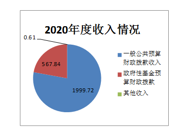 2020年本年收入2568.17万元,其中:一般公共预算财政拨款收入1999.72万元,占77.87%;政府性基金预算财政拨款收入567.84万元,占22.11%;其他收入0.61万元,占0.02%。