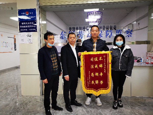 2022年1月,该单位员工蒋某反映,他们和同事们持调解书向人民法院申请执行后,人民法院对用人单位的资产进行拍卖,员工工资已优先执行到位,为感谢东区人社局全心全意为群众办实事,他们真诚地送来锦旗,为我们的工作点赞。