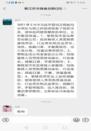 结果公示,要求的责任能完全履职到位。攀枝花市东区市场监督管理局坚持每周一次的“冷库巡查制”,并及时将每次检查到的情况在冷链食品群里进行检查结果公示。对存在问题的企业督促其立即进行整改并将整改照片发到群里,对其他从事冷链的企业也起到警示和促进作用,确保要求的责任能完全履职到位。