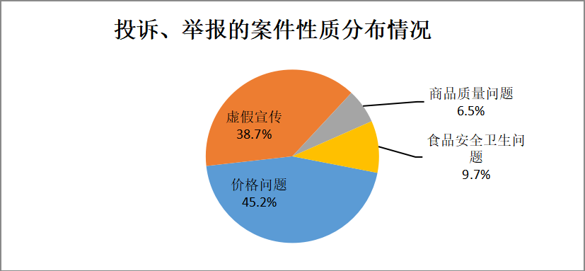 从投诉、举报性质来看,消费者投诉、举报主要集中在价格、虚假宣传等问题方面,共受理价格问题投诉、举报14件,占总量的45.2%;共受理虚假宣传投诉、举报12件,占总量的38.7%;共受理商品质量问题投诉2件,占总量的6.5%;共受理食品安全卫生问题投诉3件,占总量的9.7%。
