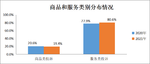 从商品和服务类别来看,在所有投诉中,商品类投诉为6件,占总投诉量的19.4%,与去年同期相比,比重下降1.2个百分点;服务类投诉为25件,占总投诉量的80.6%,比重上升2.7个百点。