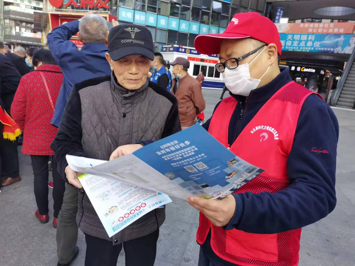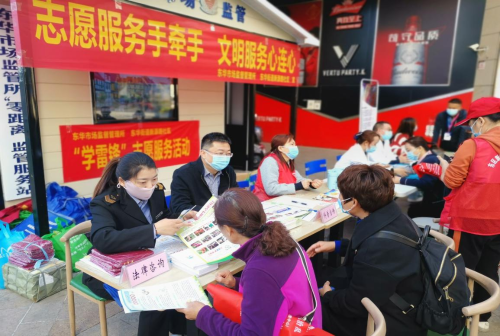 在中环天地商业圈,局机关党支部、东华市场监管所、新源路社区、美年大健康体检中心联合开展了“志愿服务手牵手 文明实践心连心”文明实践志愿服务活动。“这是小学生用药安全知识”、“经营户企业年报在手机上操作程序 从这里进入”,东区市场监管局志愿者们向过往群众开展法律咨询、科普宣传;向经营户发放食品、药品从业人员免费体检单,指导群众下载安装国家反诈系统,美年健康体检中心现场为群众测血压等医疗义诊。