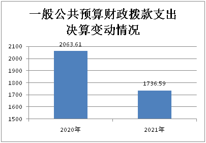 2021年一般公共预算财政拨款支出1736.59万元,占本年支出合计的100%。与2020年相比,一般公共预算财政拨款支出减少327.02万元,减少15.85%。主要变动原因是本年度根据实际工作安排,对企业补助相对去年有所减少。