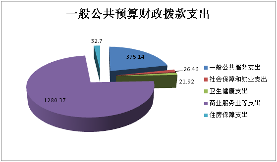2021年一般公共预算财政拨款支出1736.59万元,主要用于以下方面:一般公共服务支出375.14万元,占21.60%;社会保障和就业支出26.46万元,占1.52%;卫生健康支出21.92万元,占1.26%;商业服务业等支出1280.37万元,占73.73%;住房保障支出32.7万元,占1.89%。