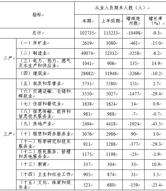三季度,东区“四上”单位从业人员102735人,同比减少10498人,下降9.3%,较二季度下降10人,较一季度增加1599人。