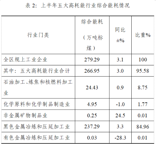 从高耗能行业看,上半年东区五大高耗能行业综合能源累计消费266.95万吨标煤,同比增长3.0%,占规上工业综合能耗的95.58%。其中能耗占比较大的石油加工、炼焦和核燃料加工业增长0.9%,黑色金属冶炼和压延加工业增长3.3%,两大行业拉动规上工业综合能耗增长2.9个百分点。