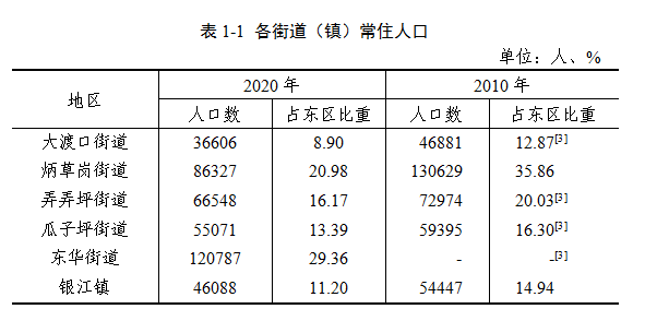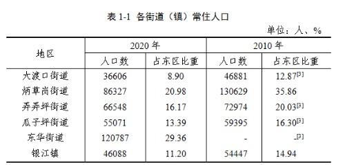 [3]因2019年各街道(镇)行政区划调整,2010年大渡口街道、弄弄坪街道、瓜子坪街道常住人口已按调整后行政区划作了修订;炳草岗街道部分社区划入新设立的东华街道,东华街道2010年无相关数据,炳草岗街道和东华街道合计人口与炳草岗街道2010年第六次全国人口普查相比。