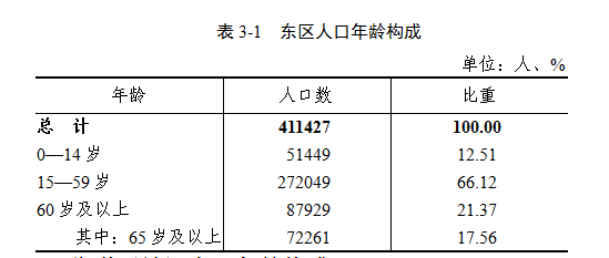 东区常住人口[2]中,0—14岁[3]人口为51449人,占12.51%;15—59岁人口为272049人,占66.12%;60岁及以上人口为87929人,占21.37%,其中65岁及以上人口为72261人,占17.56%。与2010年第六次全国人口普查相比,0—14岁人口的比重下降1.37个百分点,15—59岁人口的比重下降4.5个百分点,60岁及以上人口的比重上升5.87个百分点,65岁及以上人口的比重上升8.39个百分点。