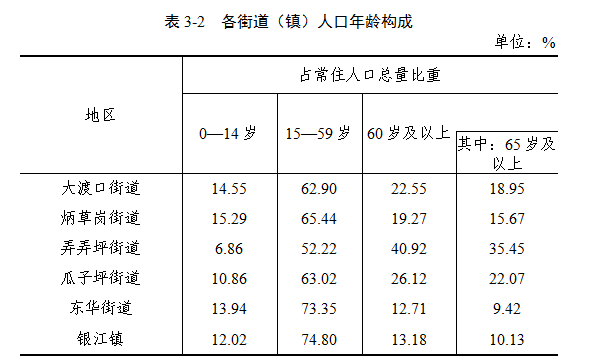6个街道(镇)中,15—59岁人口比重在60%以上的街道(镇)有5个。65岁及以上老年人口比重超过14%的街道有4个。