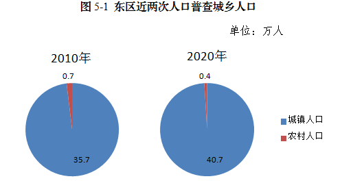 东区常住人口[3]中,居住在城镇的人口为407322人,占99.00%;居住在乡村的人口为4105人,占1.00%。与2010年第六次全国人口普查相比,城镇人口增加50397人,乡村人口减少3296人,城镇人口比重上升1.03个百分点。
