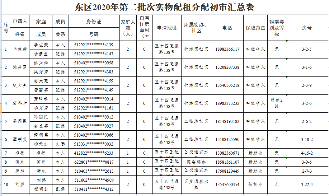 东区住房和城乡建设局已于2020年11月20日在东区住建设局二楼会议室对保障性住房进行了摇号分配,摇号分配涉及居民10户。其中中等偏下无房家庭6户;就新业无房家庭4户;如有异议请联系东区住保办:2224014。