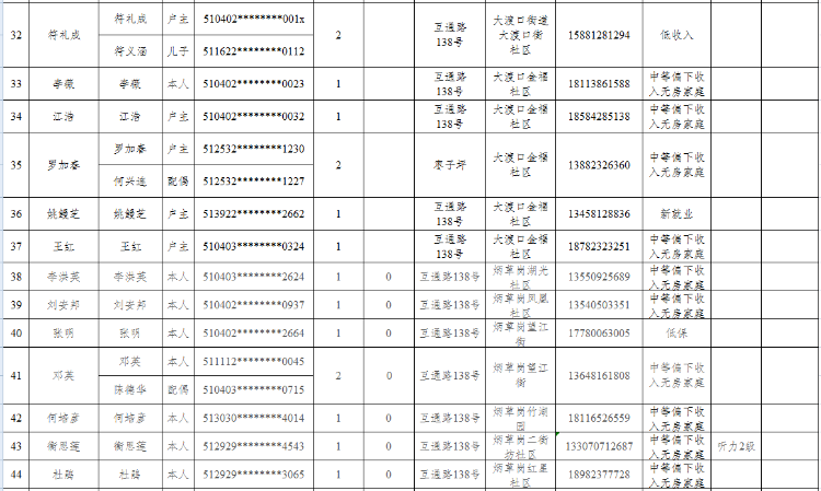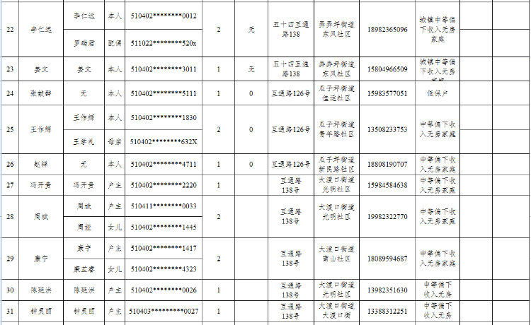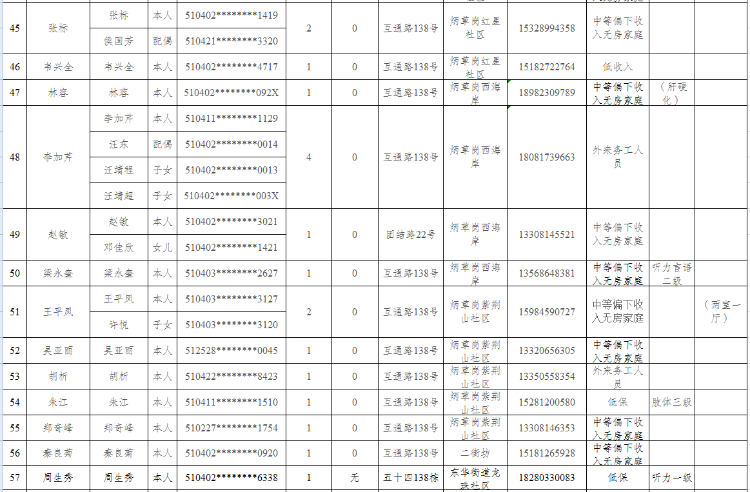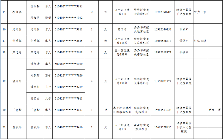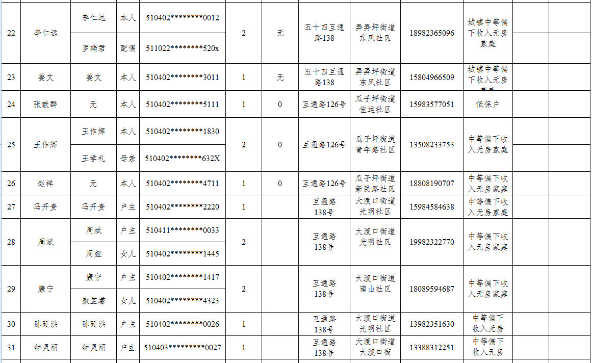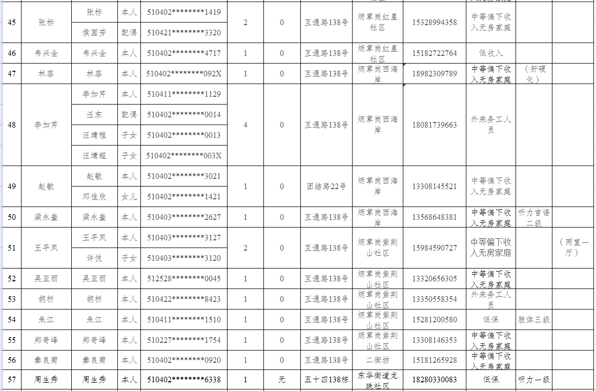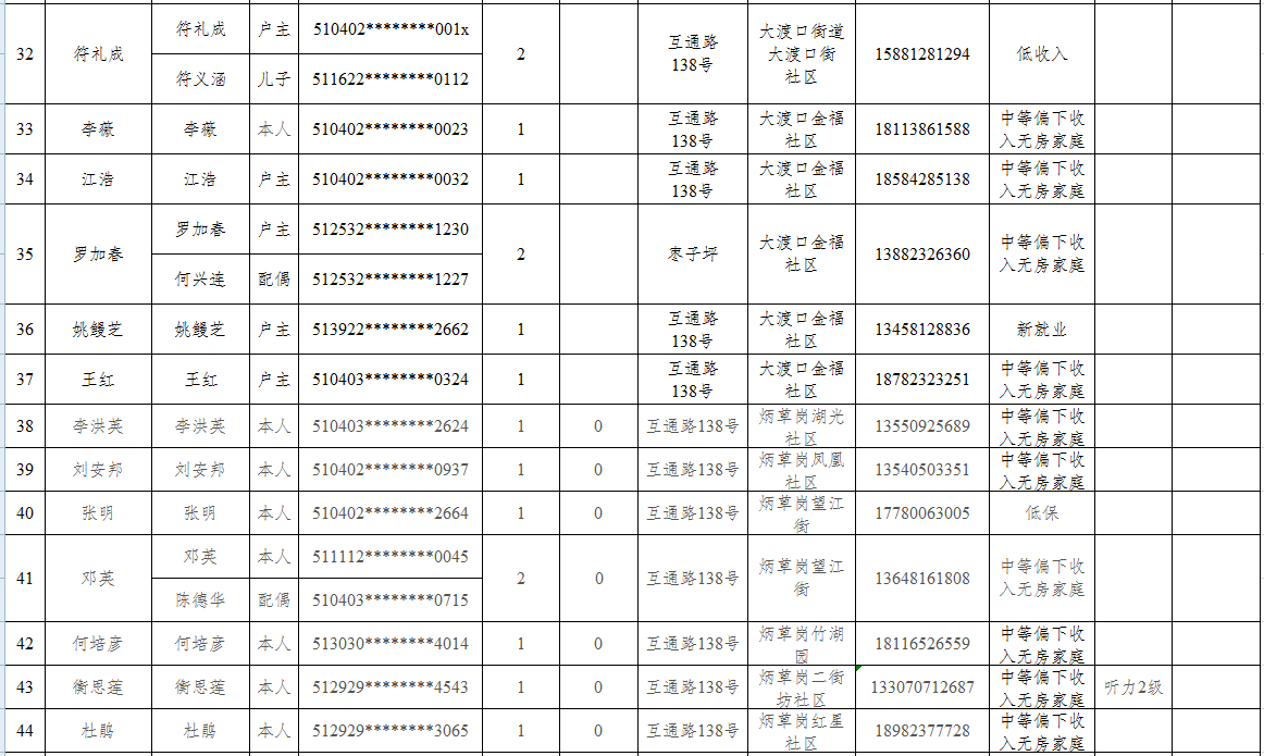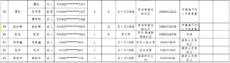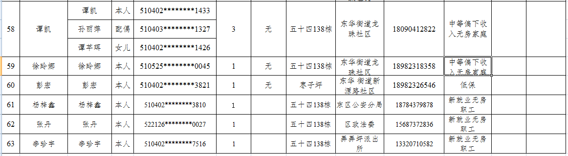 根据《攀枝花市城区公共租赁住房和廉租房并轨运行实施意见》(攀住规建发【2015】23号)文的相关精神,目前,东区2020年第三批申请、审核工作已结束。各街道(镇)上报申请资料95户,经初步审核,32户家庭不符合实物配租申请条件,63户家庭符合实物配租条件。现将63户符合申请公租房实物配租条件的家庭人员信息予以公示,如有异议请联系东区住保办:2224014.